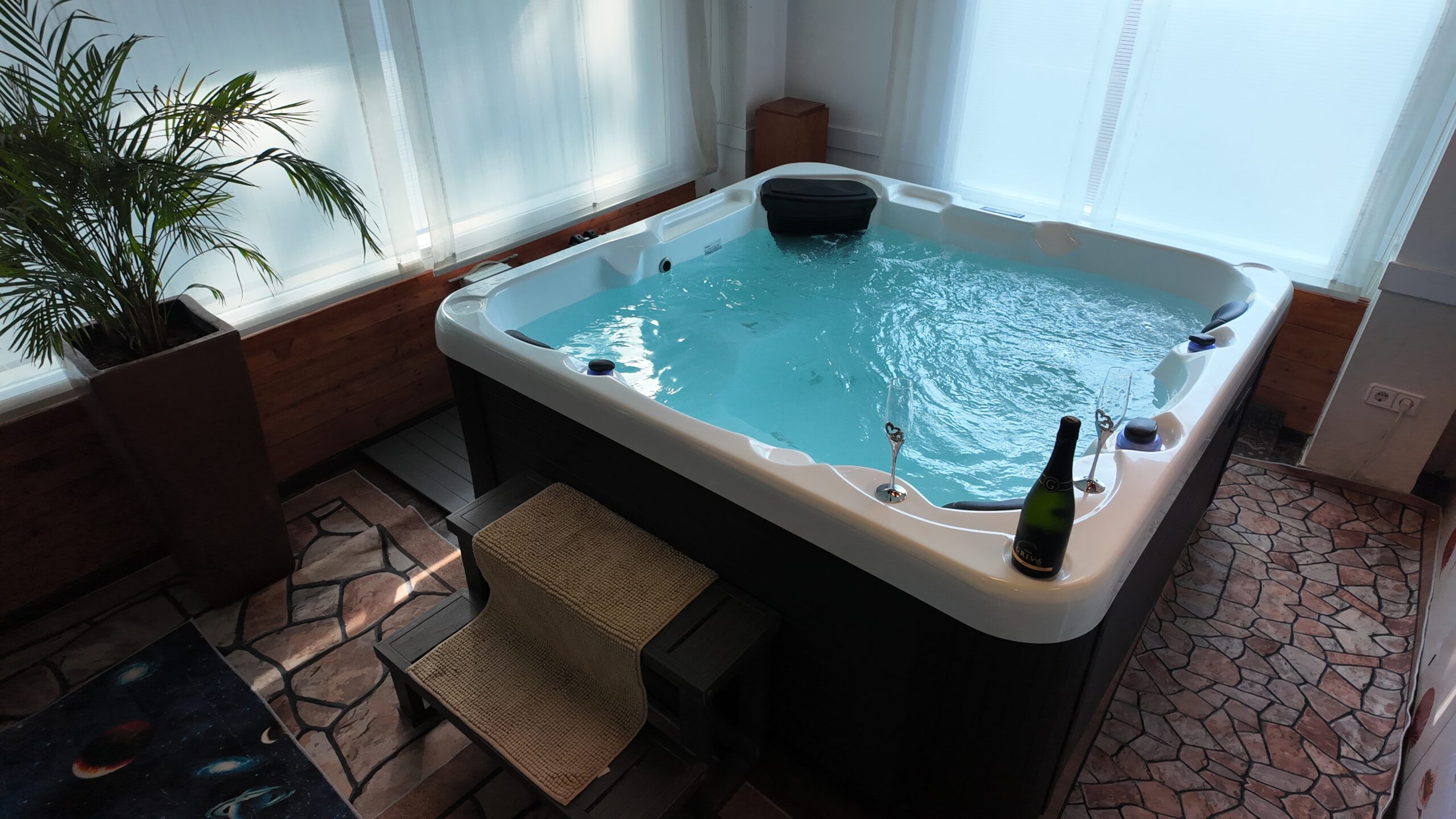 Ideal para disfrutar en pareja o en familia, cuenta con zonas de descanso, tumbonas,  un pequeño puente y una caída de agua para masajear su espalda.